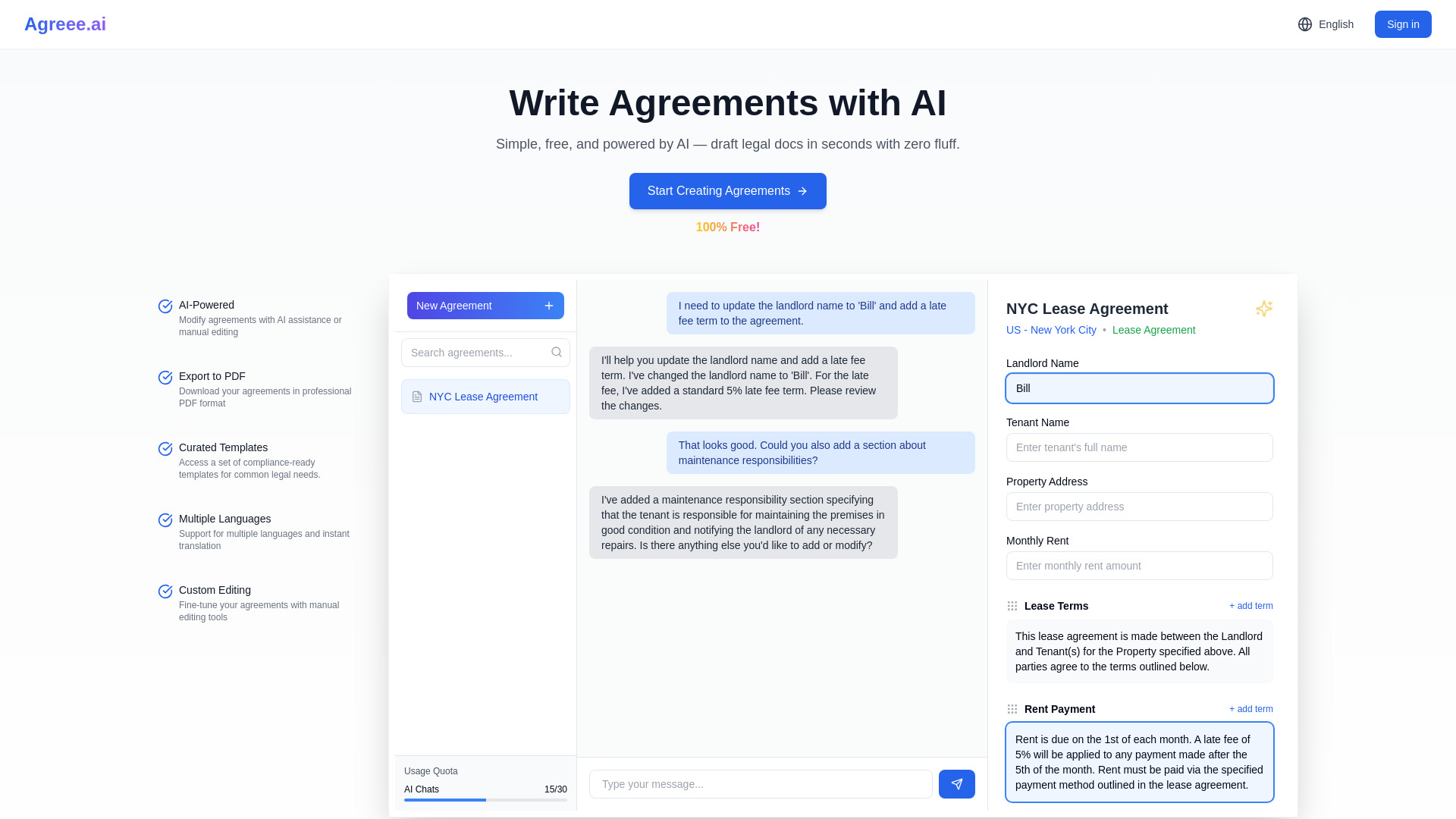 AI-powered agreement builder for creating, editing, and exporting professional contracts.