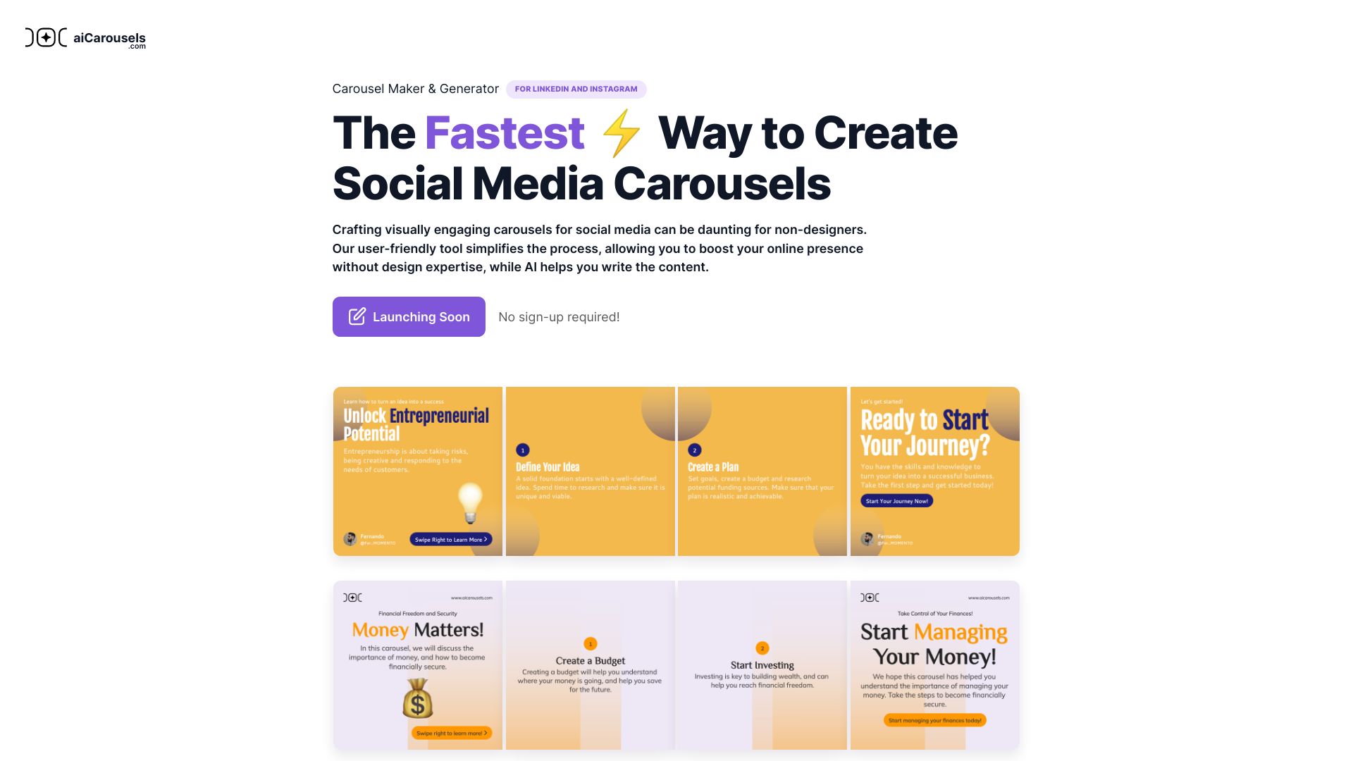 aiCarousels simplifies social media carousel creation with AI assistance for non-designers.