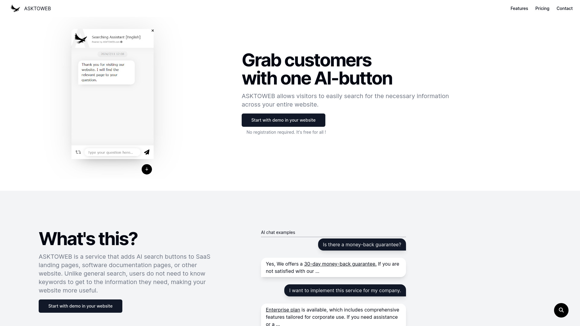 AI-powered search assistant for websites, enabling easy information retrieval and content improvement.