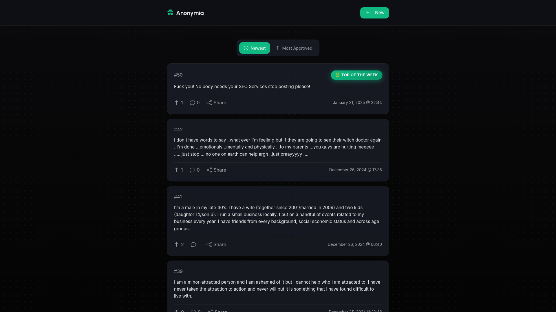 Anonymia is a platform for sharing anonymous confessions in a safe and private community.