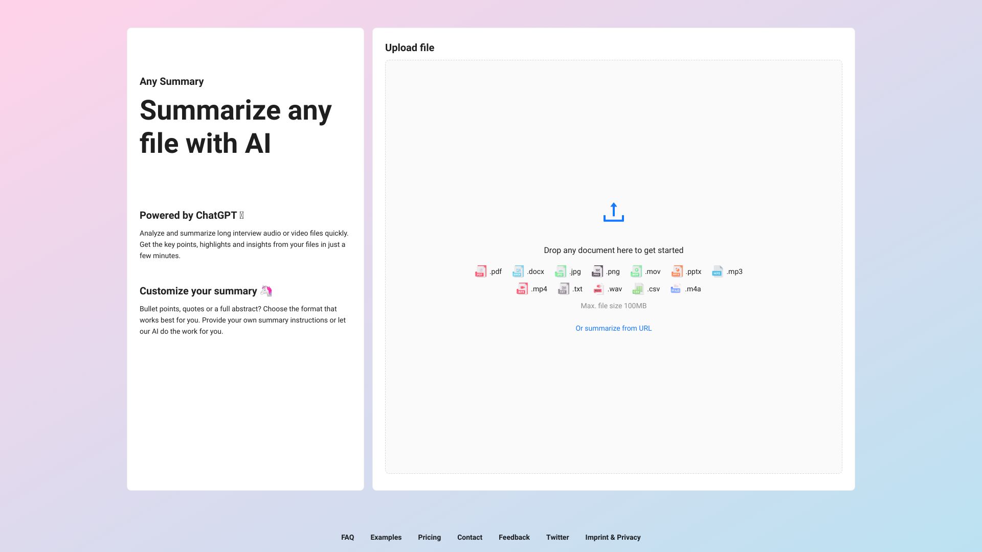 AI-powered summarization of text, audio, and video files.