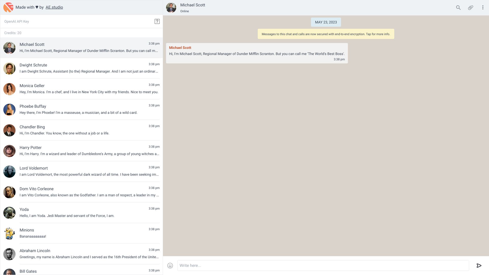 Chatbot platform for interacting with famous figures using AI impersonation.