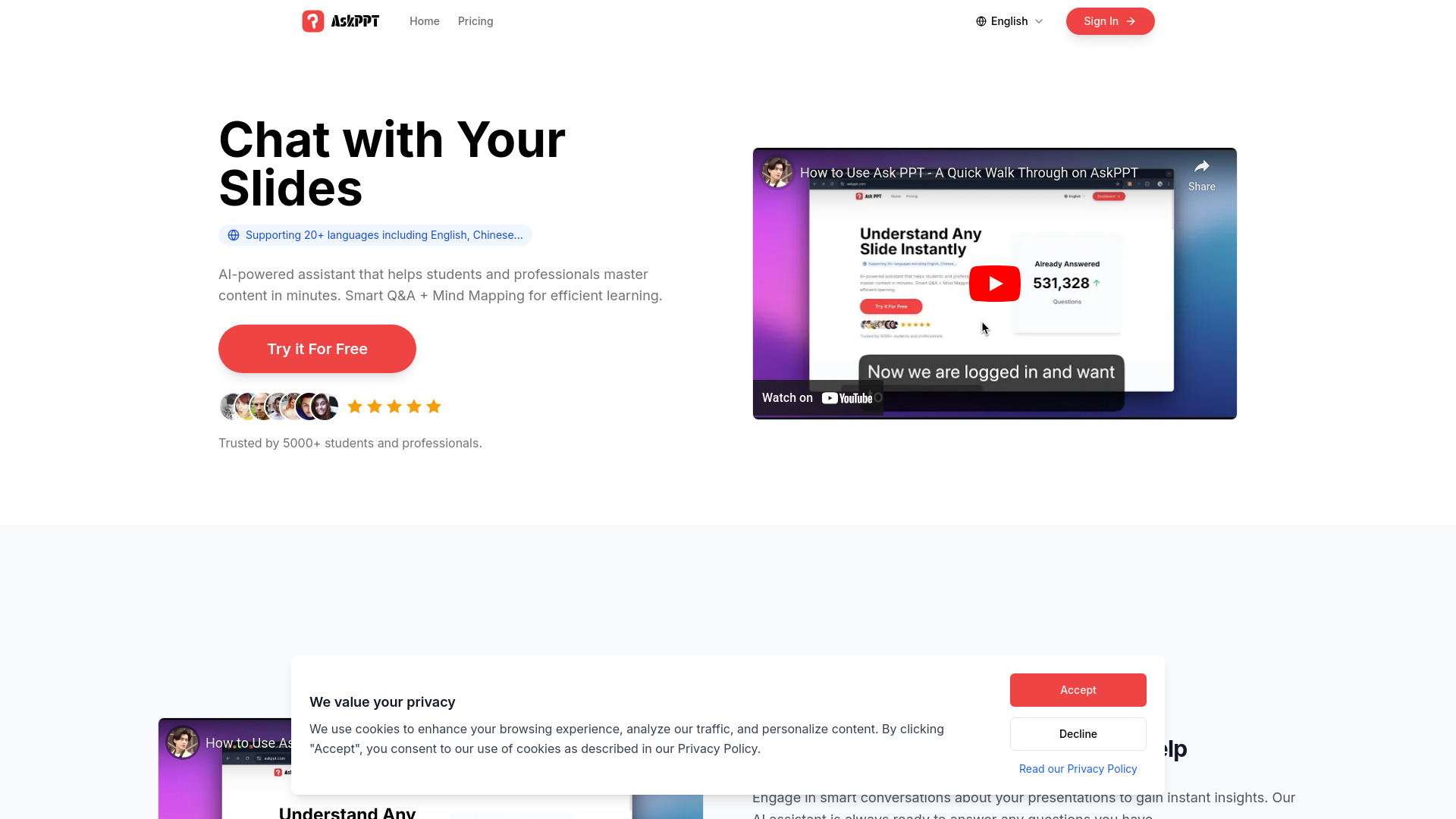 AI-powered assistant for chatting with presentations, offering smart Q&A and mind mapping.