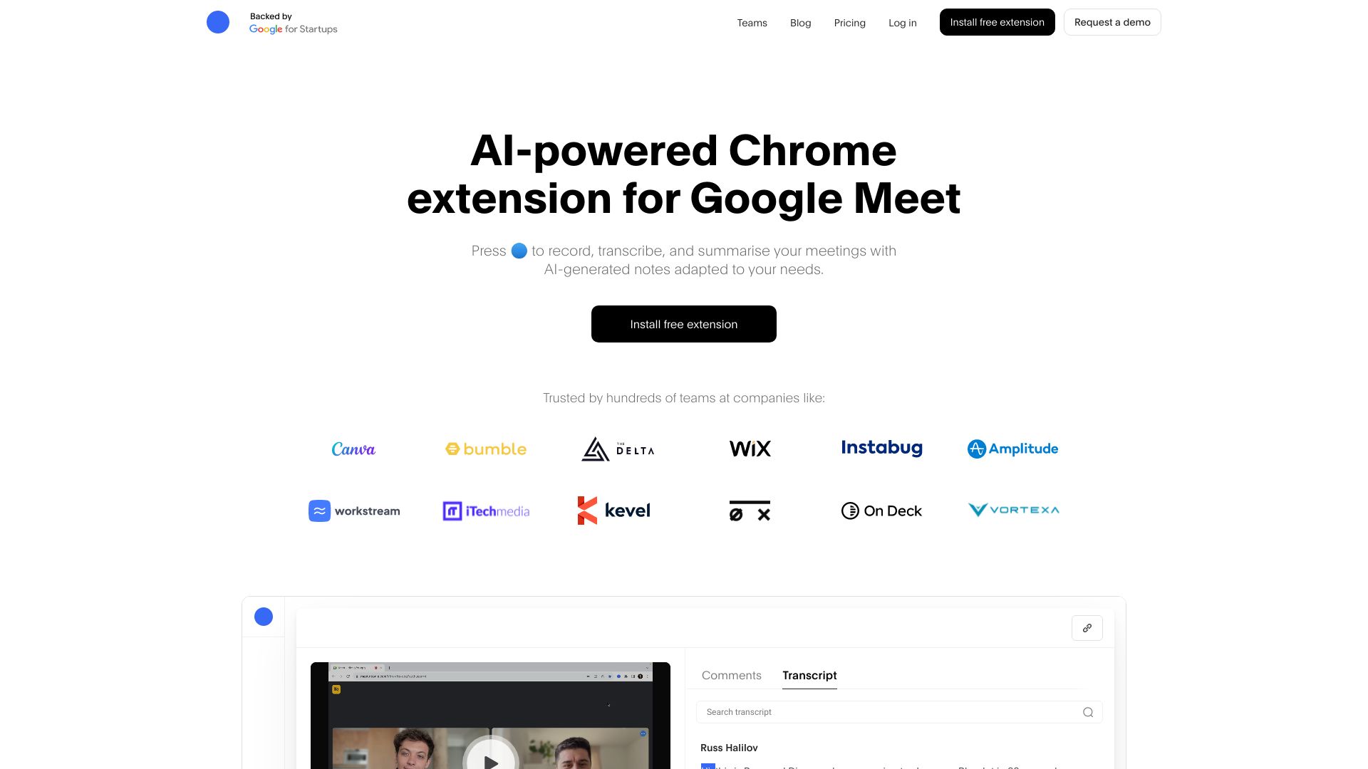AI note taker, transcription, and meeting summary tool for Google Meet, Zoom, and MS Teams.