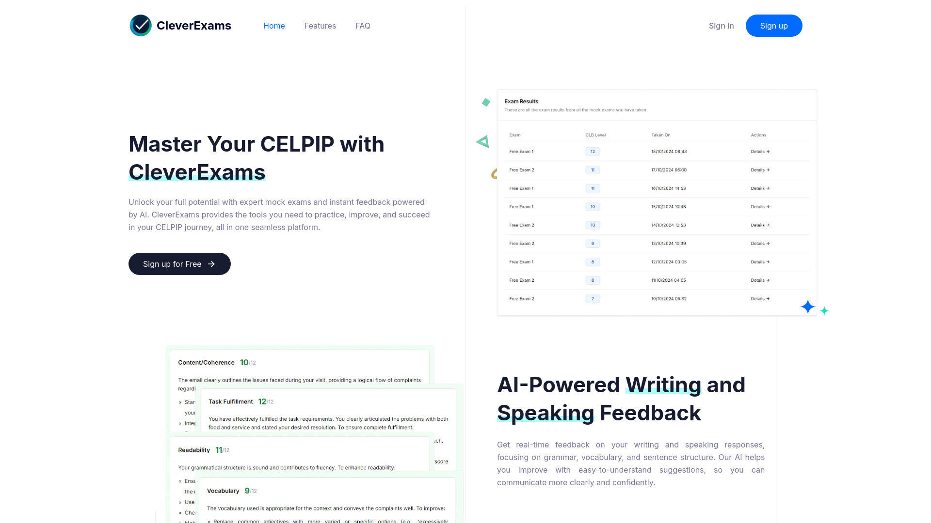 Online platform for CELPIP exam preparation with AI feedback and mock exams.