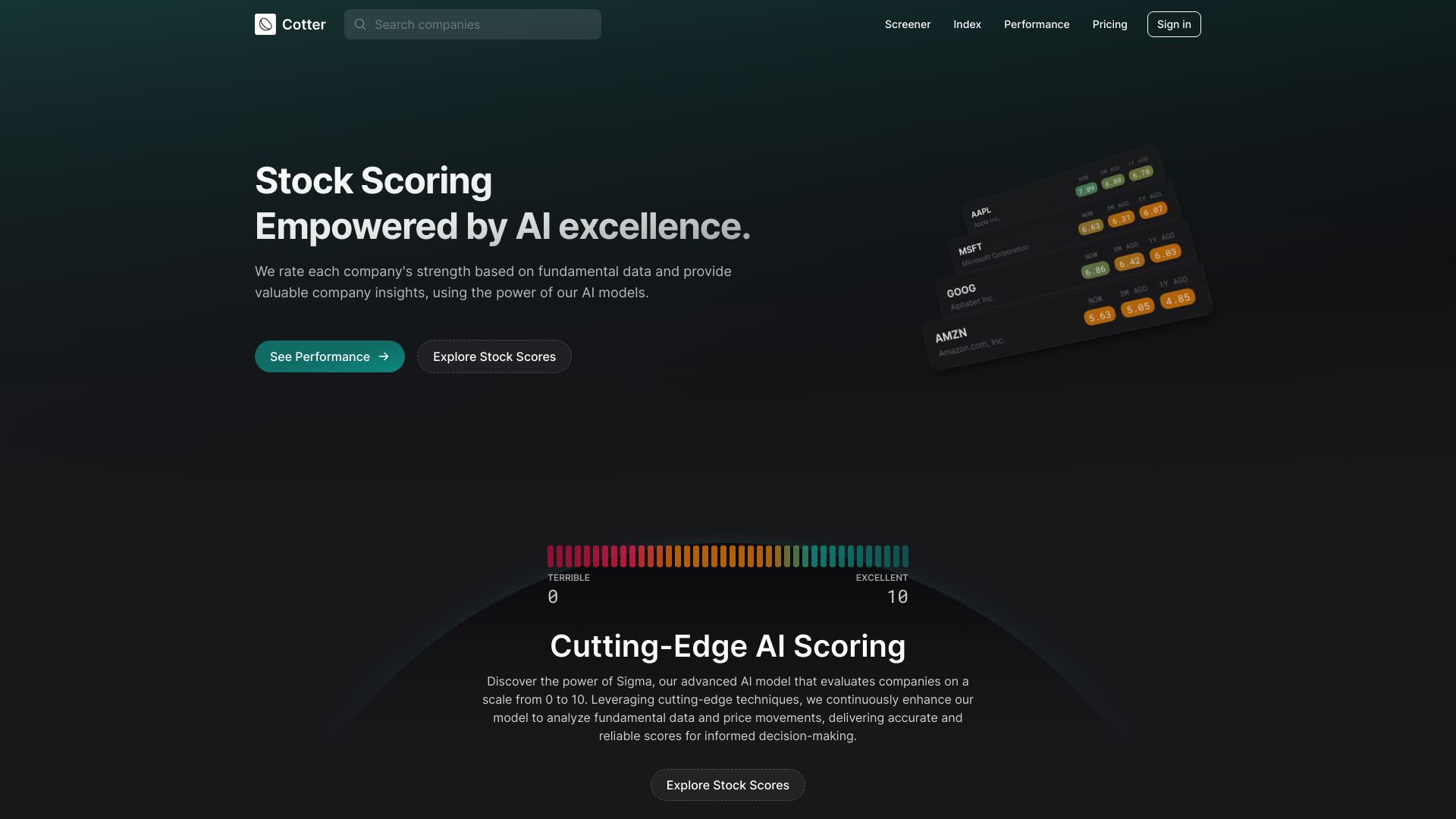 Cotter is an AI-powered stock analysis tool providing company scores based on fundamental data.
