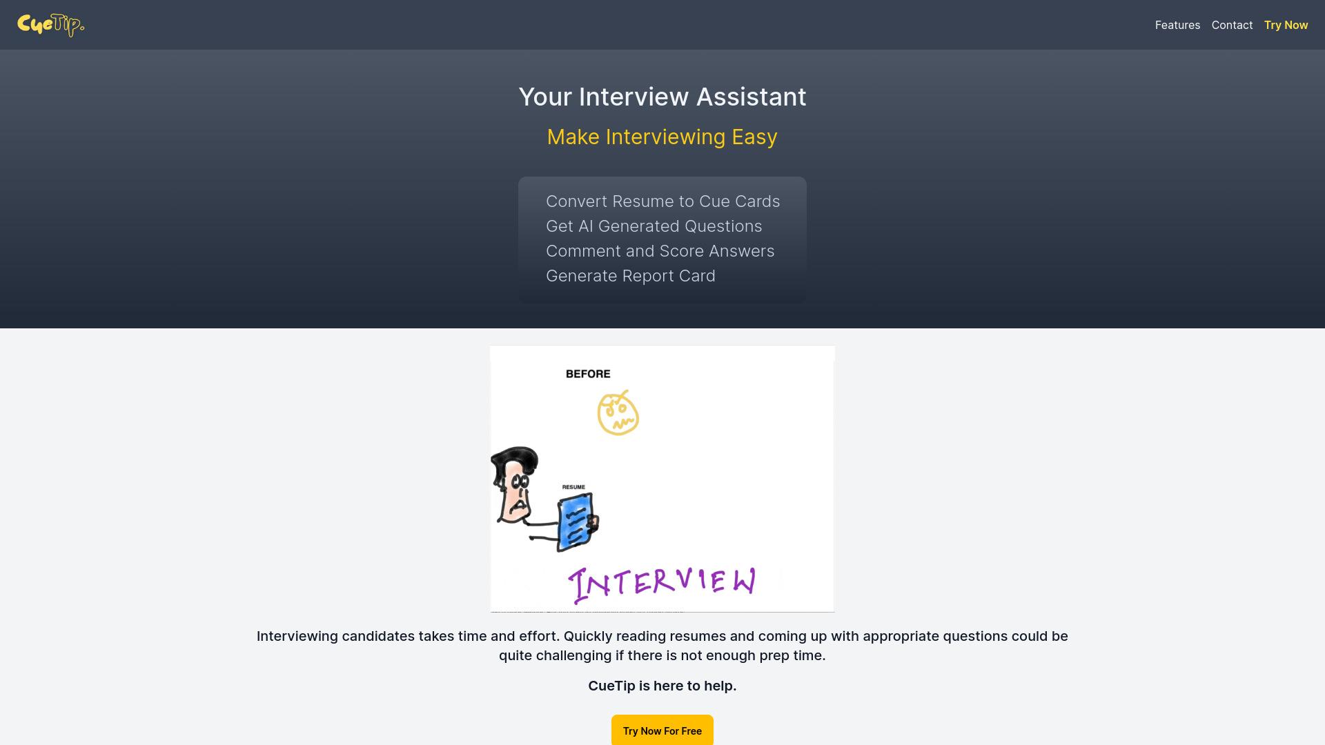 CueTip is an AI interview assistant that generates resume summaries, questions, and interview reports.