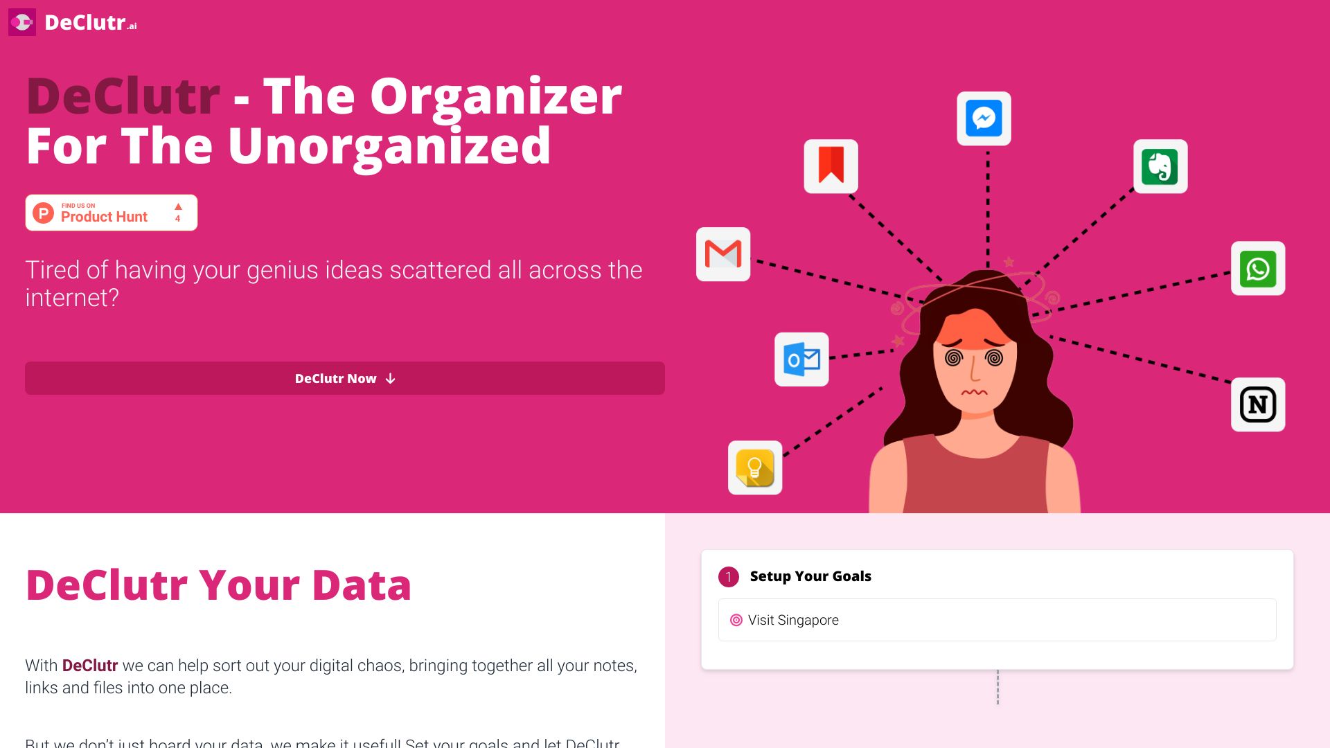 DeClutr organizes digital content, analyzes data with AI, and provides actionable insights.