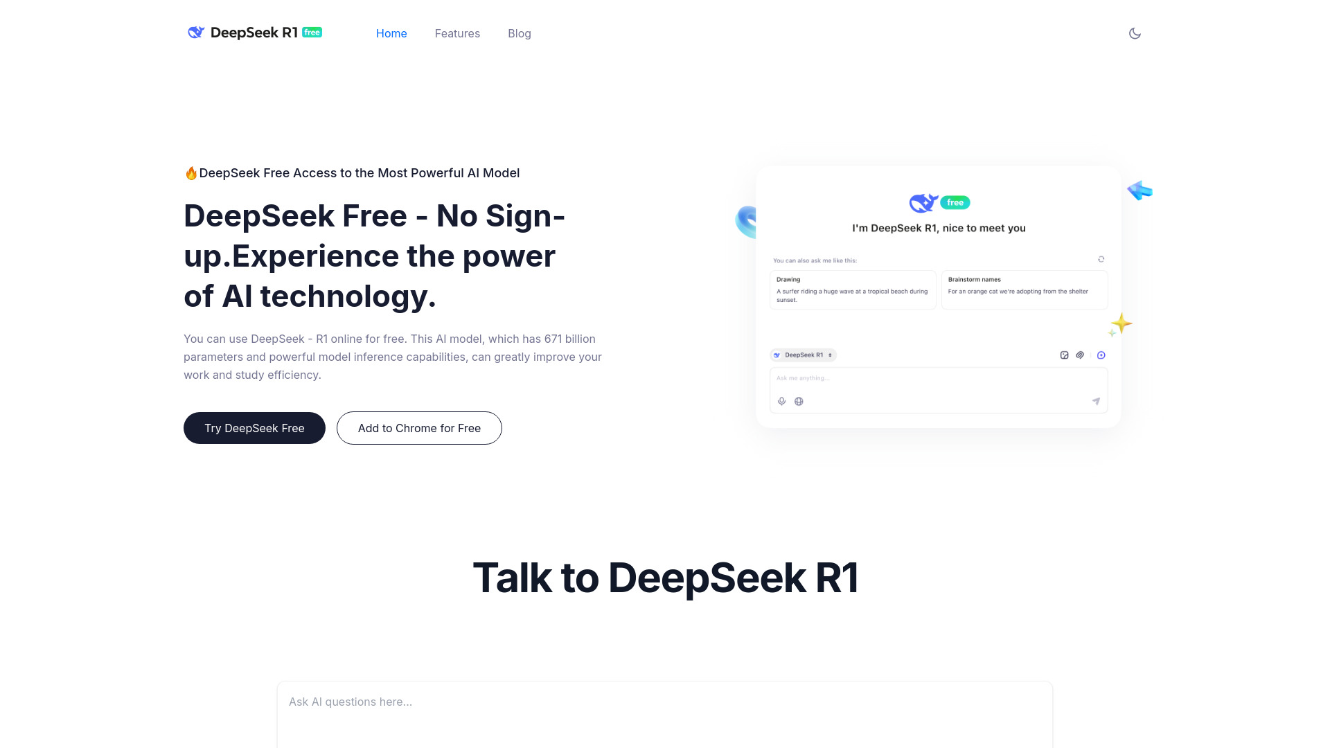 Free online access to powerful AI models DeepSeek-R1 and DeepSeek-V3 without registration.