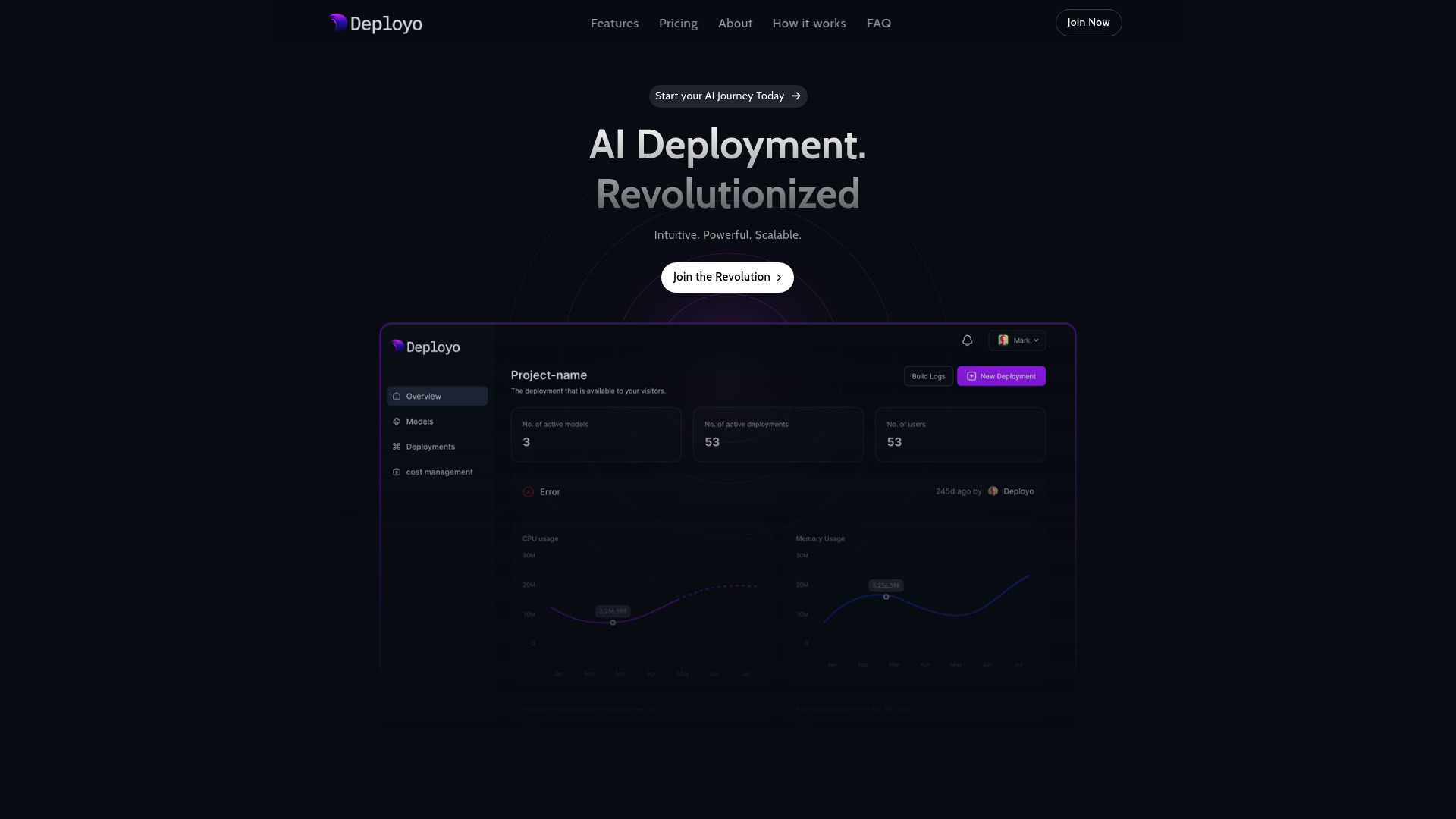 Deployo simplifies AI model deployment with one-click deployment, automatic scaling, and real-time monitoring.