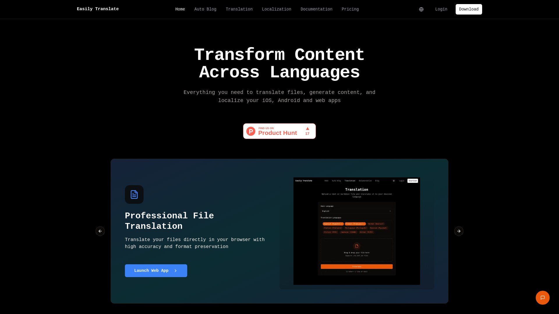 Translation platform with AI blog generation and app localization.