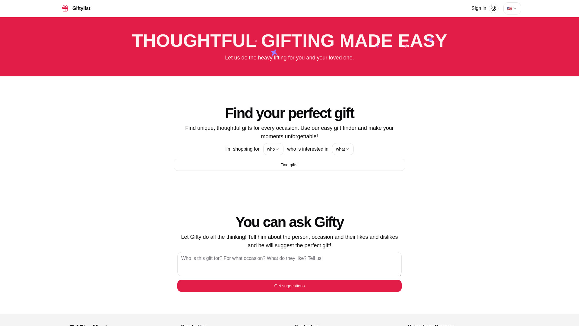 AI-powered gift suggestion website for finding thoughtful and unique gifts.