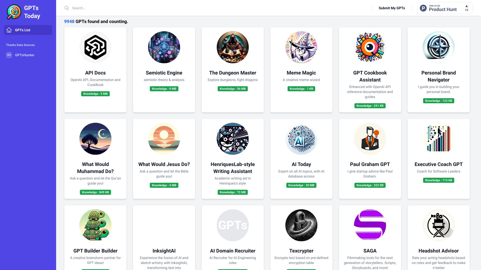 A website for discovering and searching over 9,000 interesting and useful GPTs.