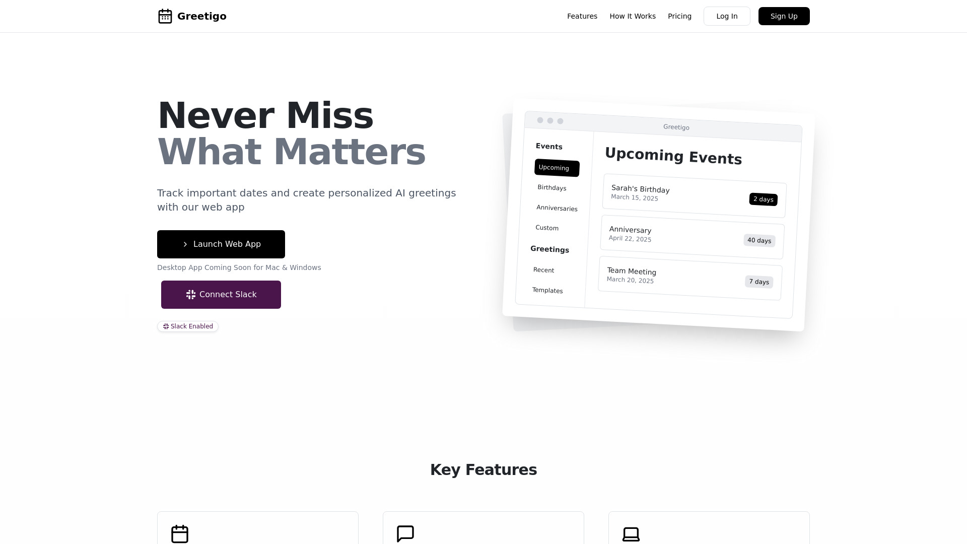 Greetigo is a desktop app for AI-powered reminders and personalized greetings for important dates.