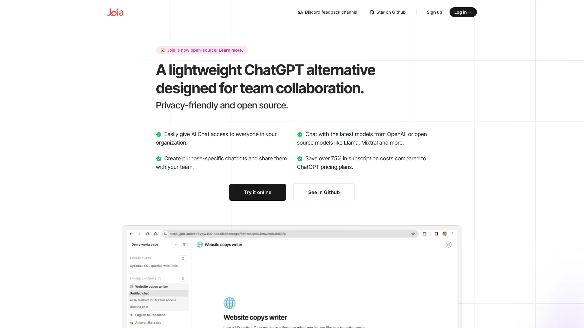 ChatGPT alternative for workplace collaboration, offering AI models, app creation, and secure hosting.