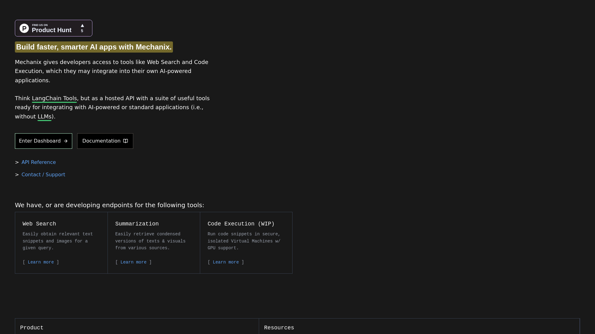 Mechanix provides developers with hosted APIs for tools like Web Search and Code Execution.