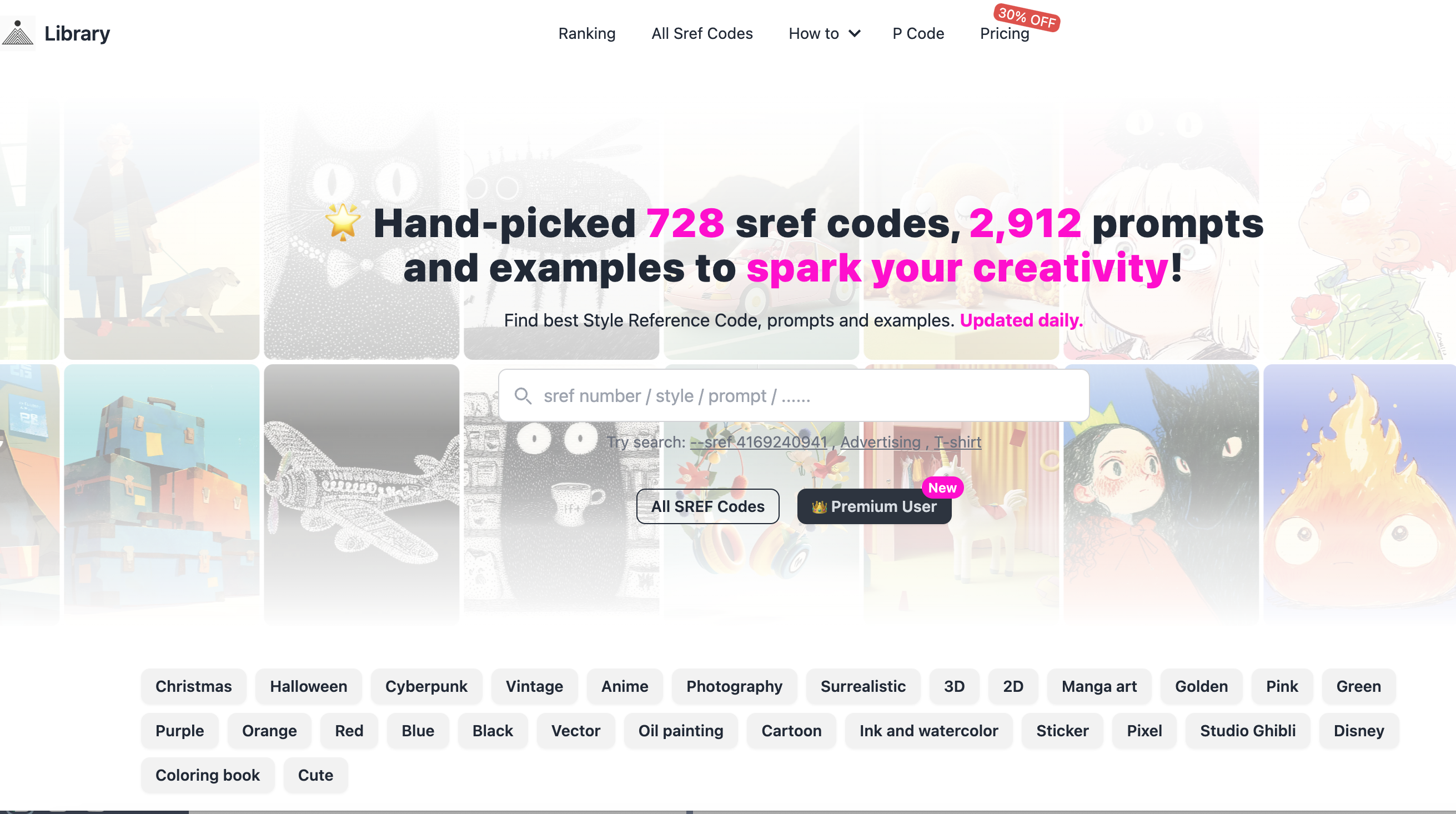 A Midjourney prompts and SREF codes library with AI tools to enhance image creation.