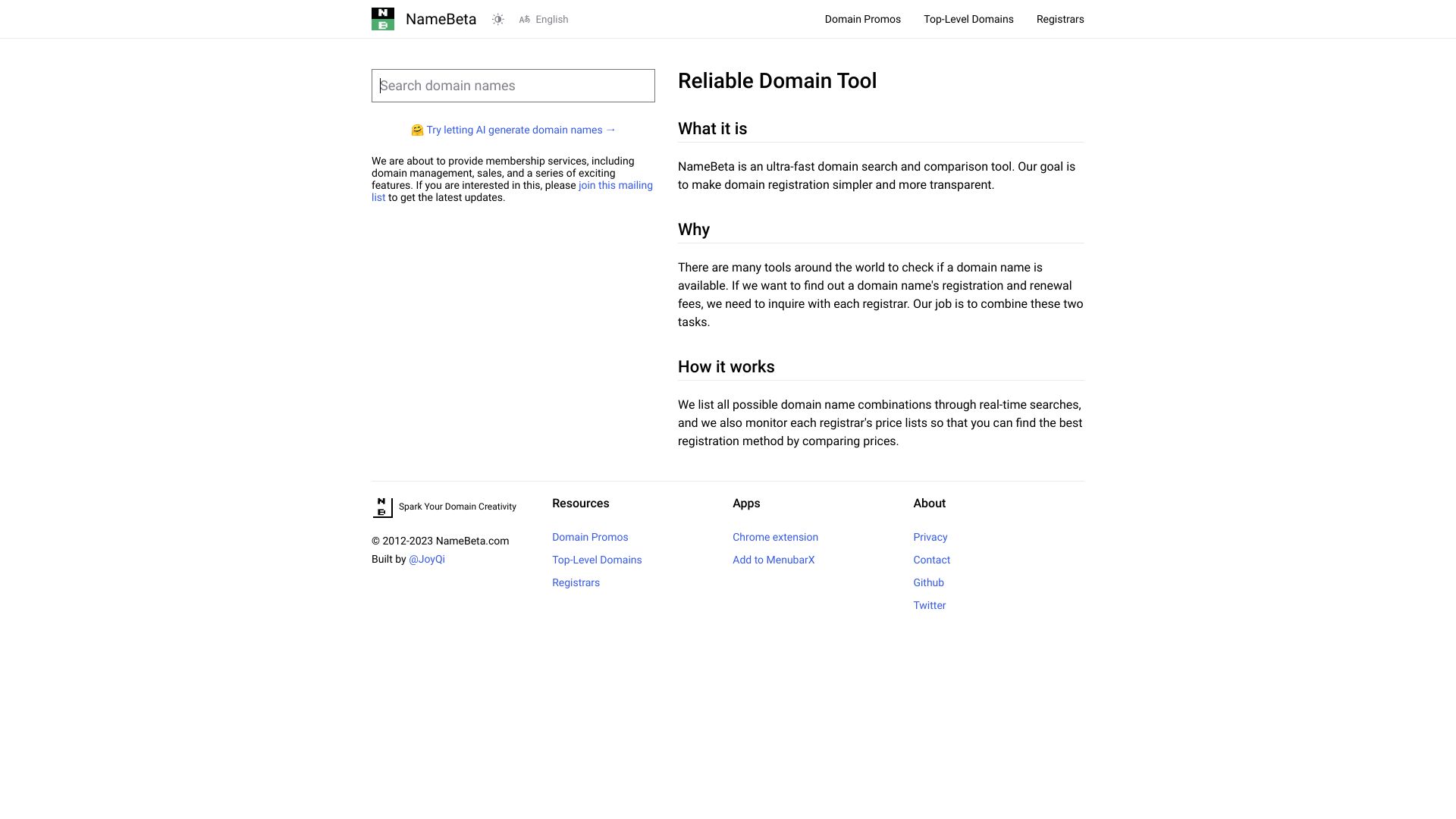 Domain search and price comparison tool with AI name suggestions.