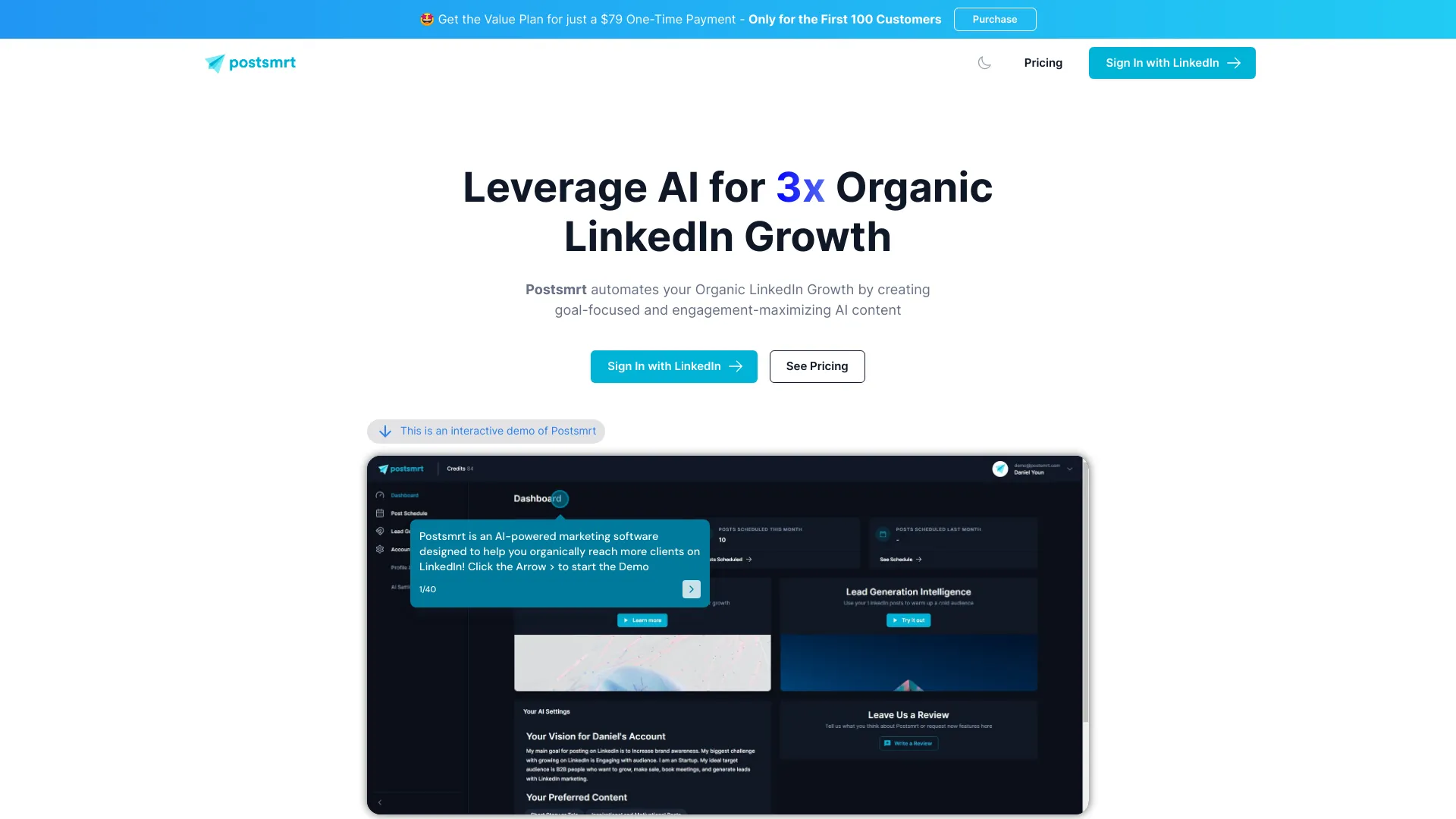 Postsmrt automates LinkedIn growth with AI-powered content scheduling and lead generation.