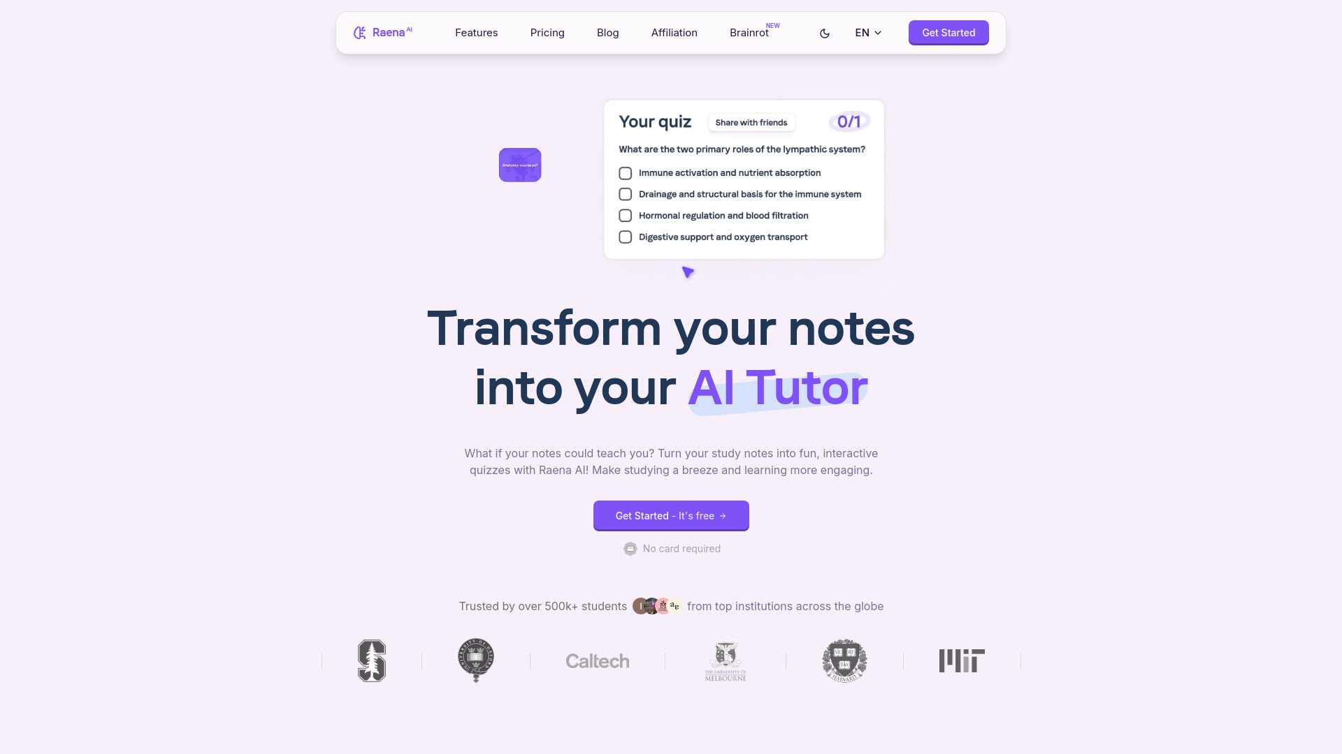 Raena AI transforms study notes into AI-powered quizzes, summaries, and learning tools.