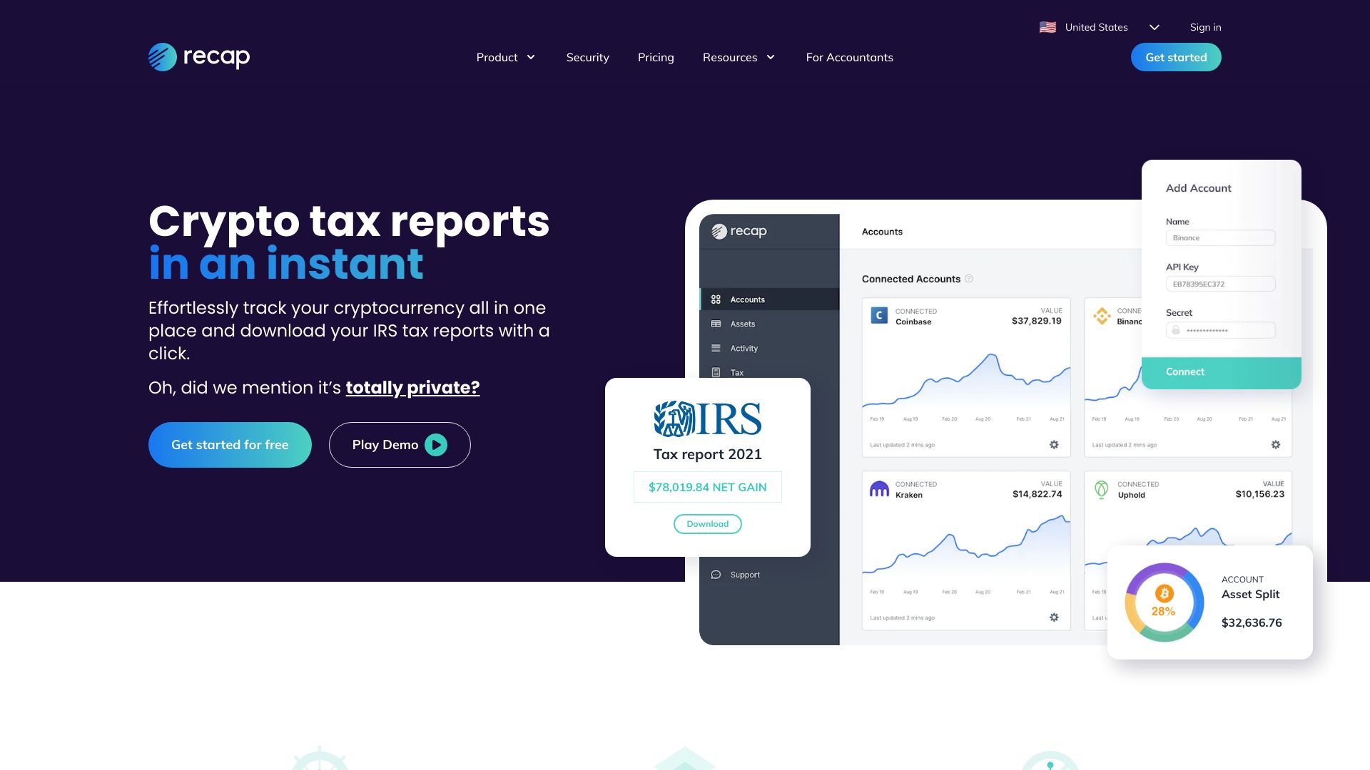 Recap is a crypto tax software and portfolio tracker with AI-driven appraisals and tax reports.