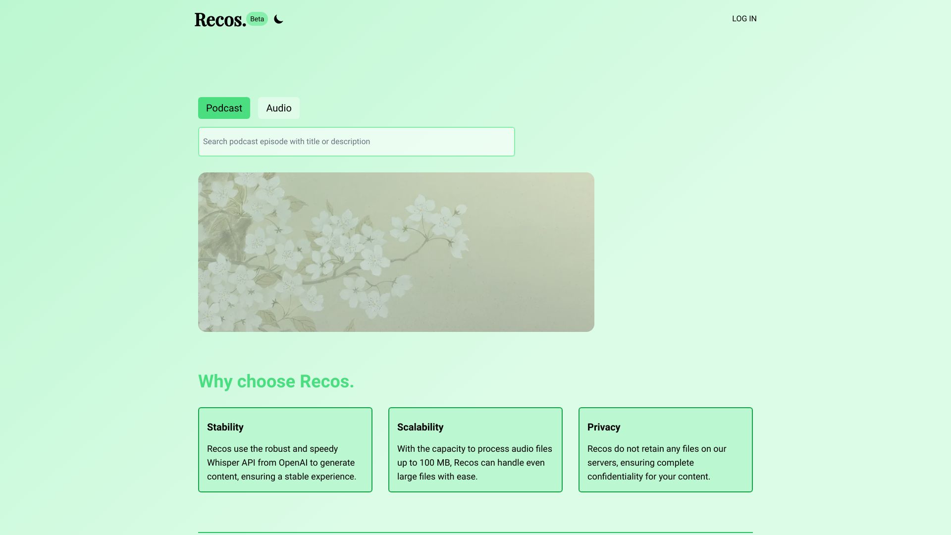 Recos transcribes audio to text using OpenAI's Whisper API, offering free credits for new users.