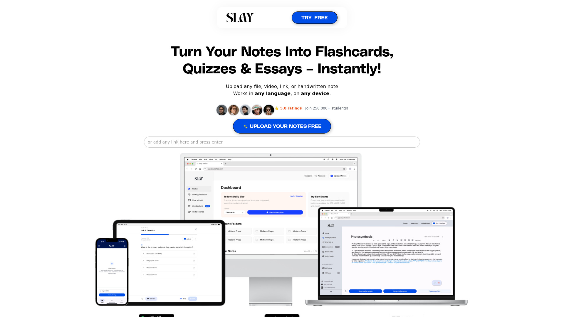 AI study tool for flashcards, quizzes, and essay writing from various content types.