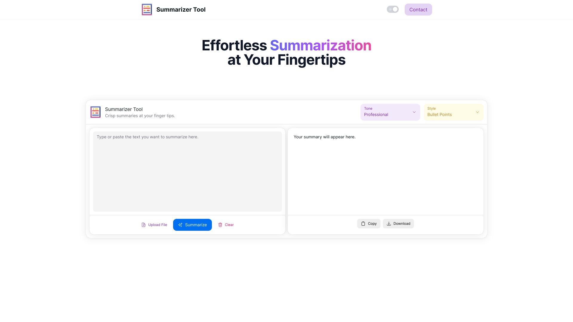 AI-powered tool for effortless text summarization with customizable tone and style.