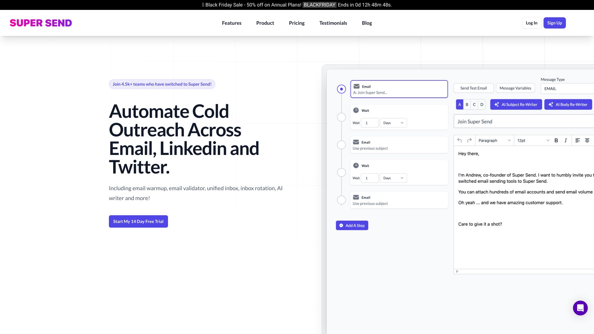 Cold outreach automation software across email, LinkedIn, and Twitter with unified sequences.