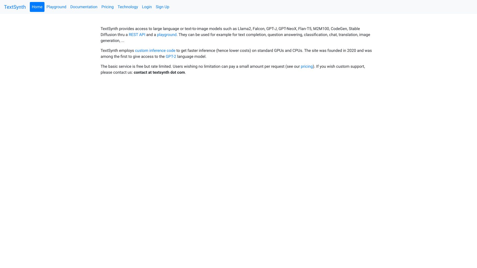 TextSynth offers access to various AI models via API and playground.