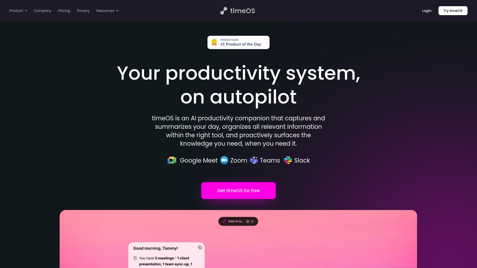 AI-powered time management tool for meeting preparation, notes, and scheduling.