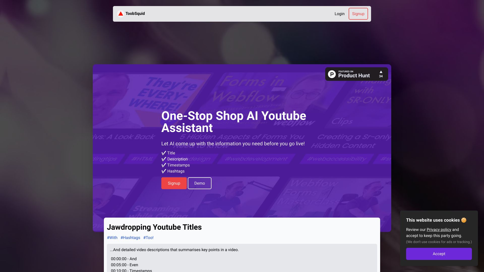 ToobSquid uses AI to generate SEO-optimized YouTube titles, descriptions, and more from unlisted videos.