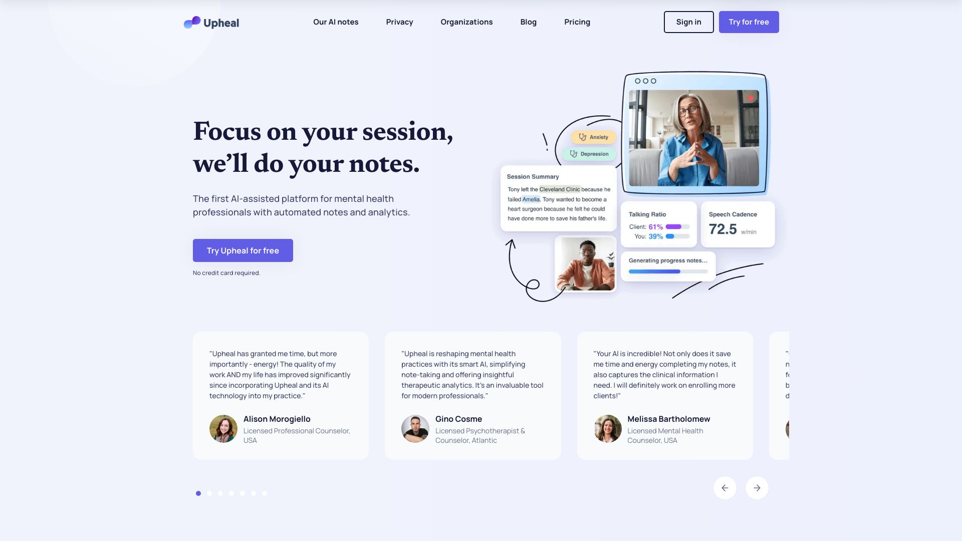 AI-powered platform for mental health professionals, automating notes and providing session analytics.