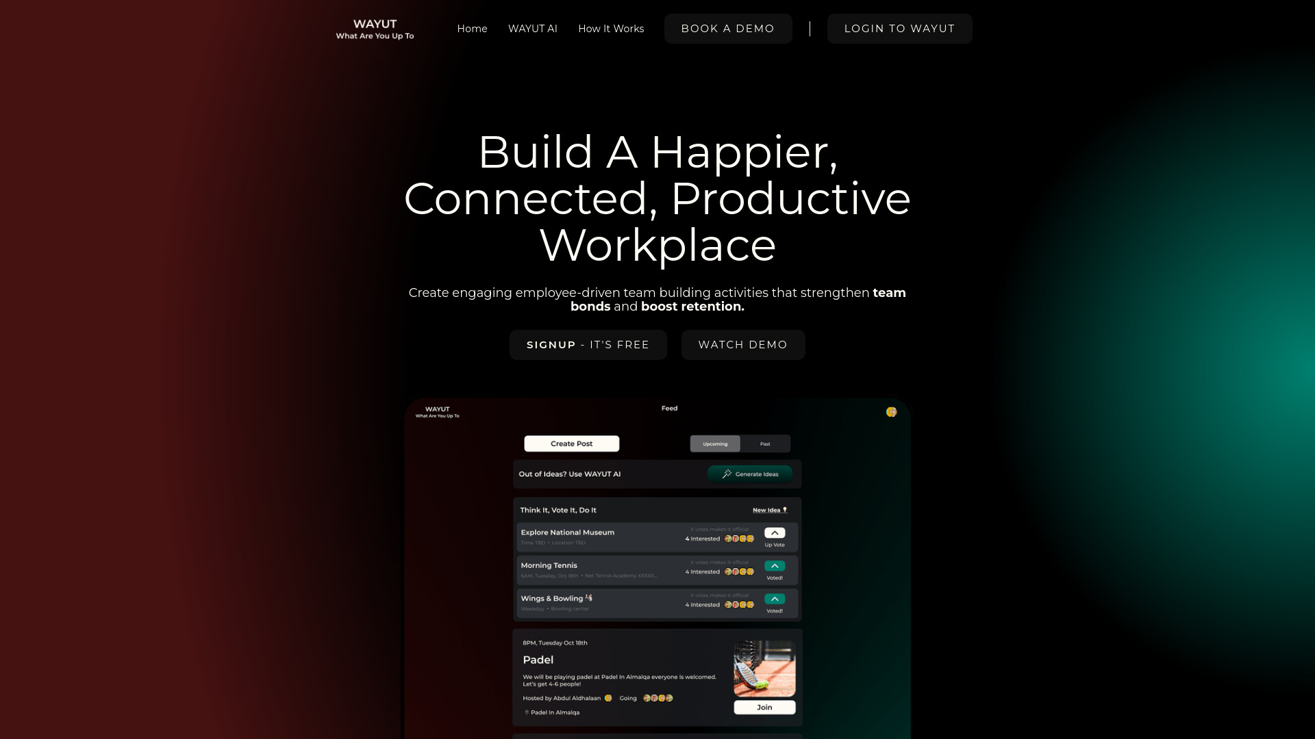 WAYUT is a platform for employee engagement, team building, and retention through shared activities.