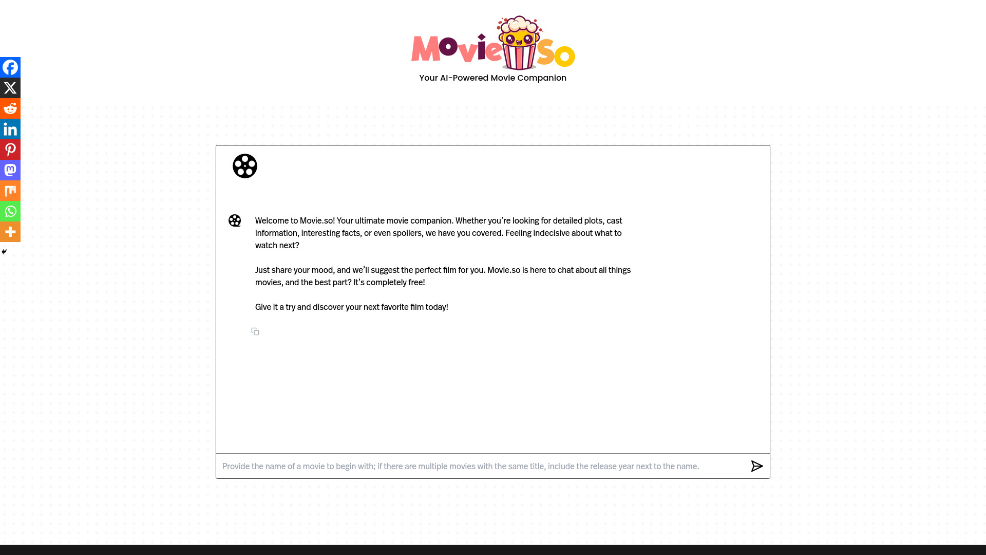 AI-powered movie companion for plots, cast info, facts, and movie suggestions.